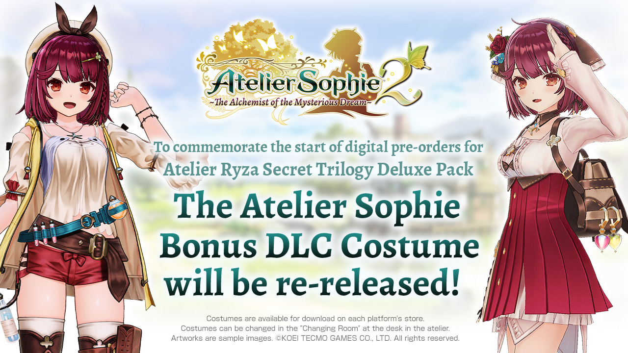To celebrate the release of Atelier Ryza Secret Trilogy Deluxe Pack on November 13th, previously available DLC will be re-released, including costumes for Sophie that are inspired by Ryza, the protagonist of Atelier Ryza: Ever Darkness & the Secret Hideout, along with other costumes.
